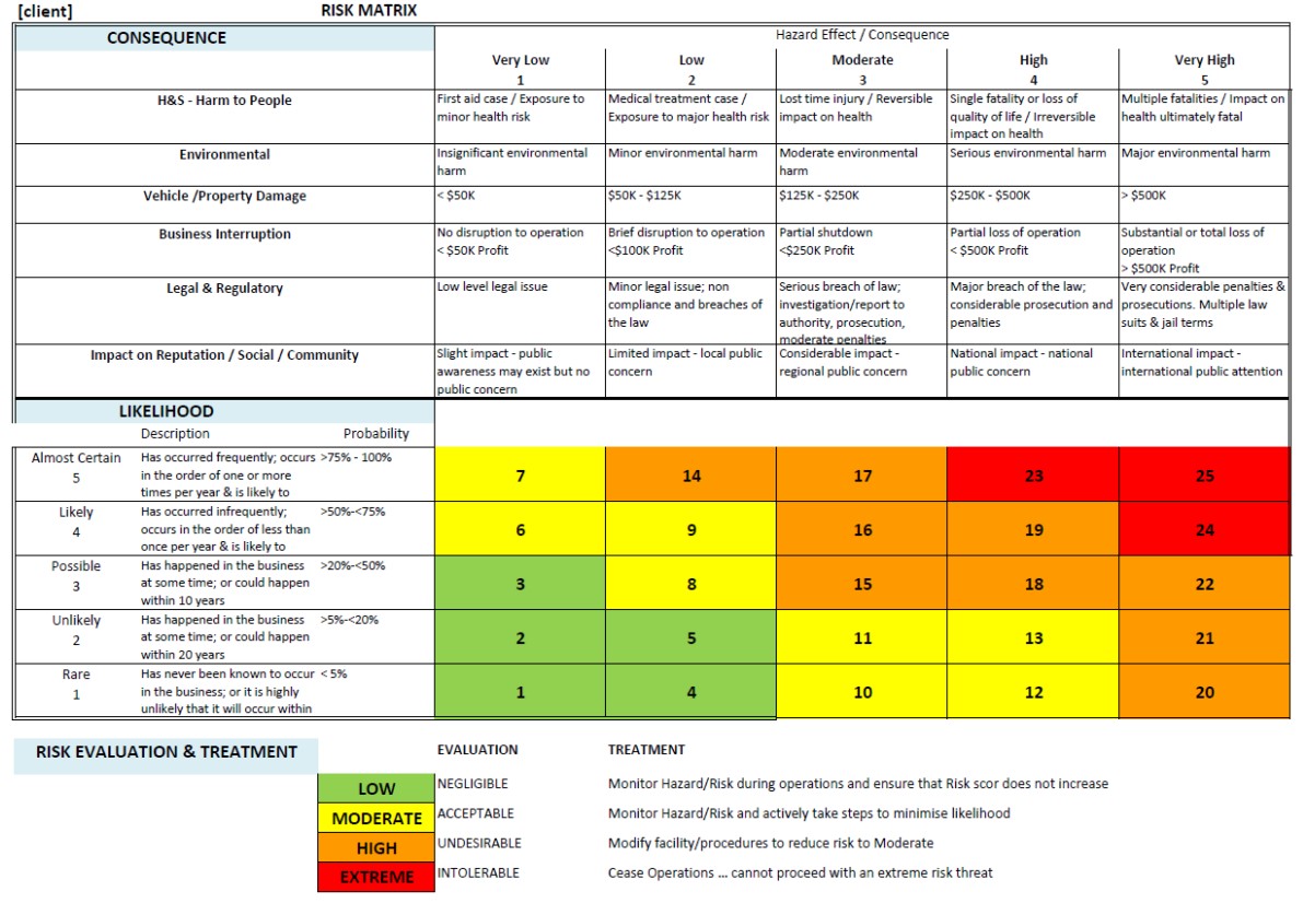 Risk Assessment is the process of identifying hazards to an operation, assigning a Likelihood and Consequence to hazardous events and then determining a Risk score.